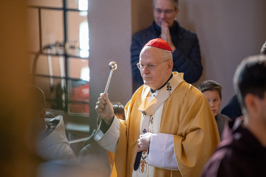 Erdő Péter a szentmise elején a díszes asszisztencia élén körbejárt a templomban, és megáldotta az épületet és a benne összegyűlt híveket.
