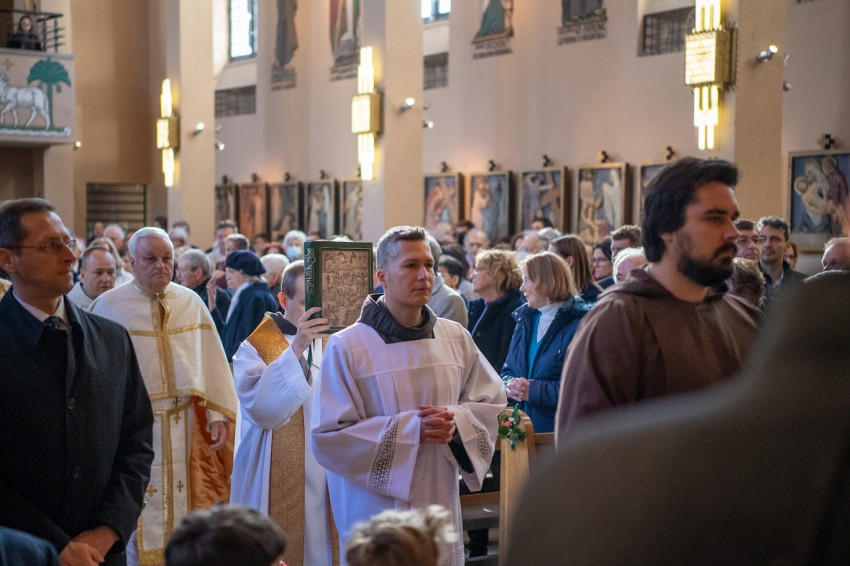 Kálmán Peregrin, miután köszöntötte a jelenlévőket, elmondta, hogy a pasaréti templomot 1934-ben Serédi Jusztinián bíboros szentelte fel. 1948-ban Isten szolgája Károlyi Bernát vezetésével Mindszenty bíboros bebörtönzése napján nyilvánosan imádkoztak a hívek az elhurcolt prímásért, és sokszor talált itt testvéri befogadásra a szerzetesi és hívőközösségben a ferences rendi Paskai László bíboros. A plébános felhívta a figyelmet, hogy a pasaréti plébánia múltjához azáltal is kapcsolódnak, hogy azzal a kehellyel miséznek, amelyet a hívek első ajándékként adtak a ferences plébániának.